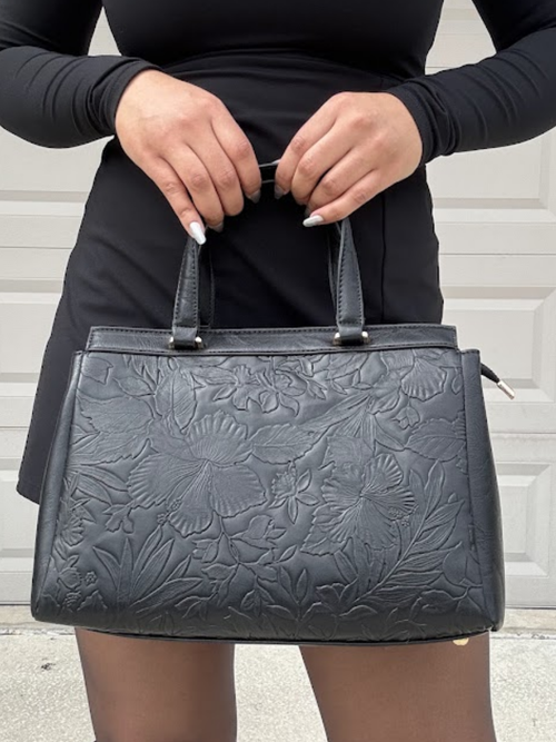 Floral Embossed Satchel Handbag – Black